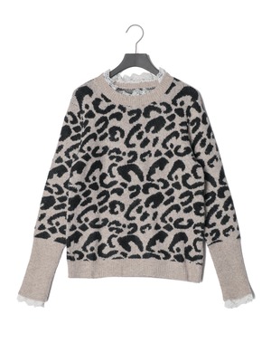 motté モッテ レーストリミングレオパードニット/ ベージュ×ブラック